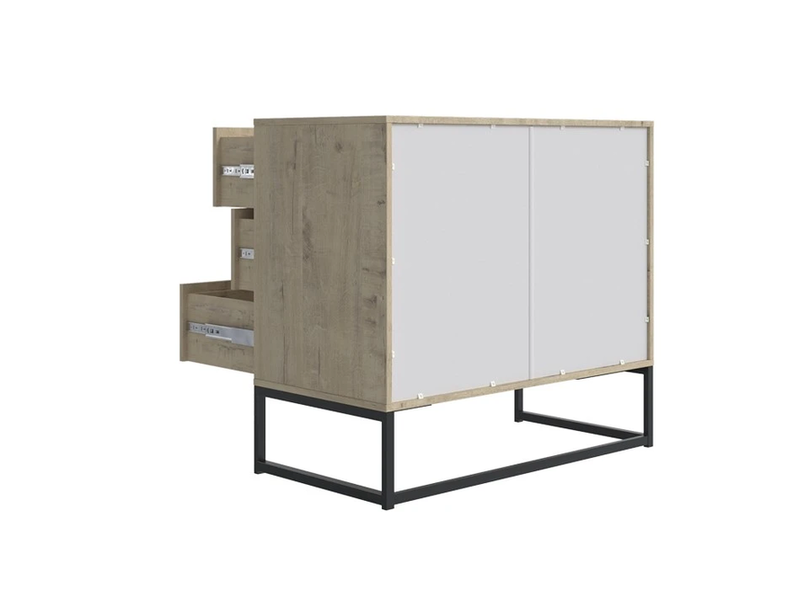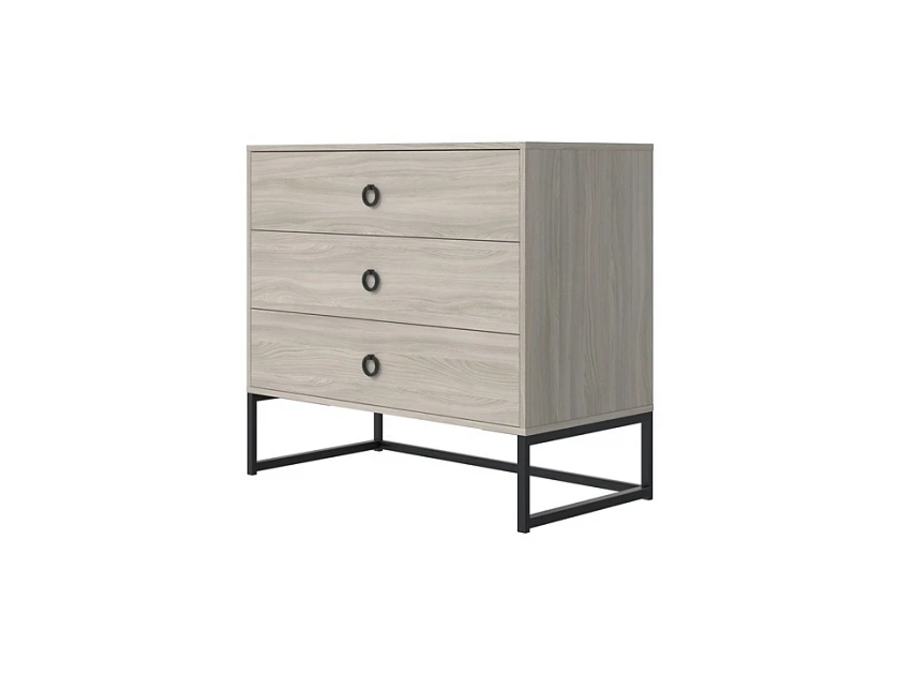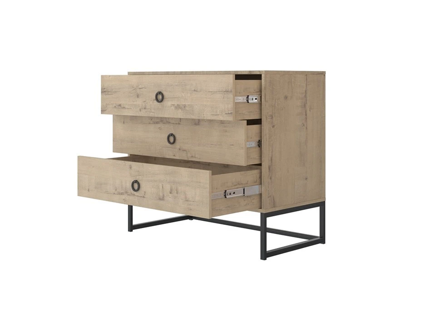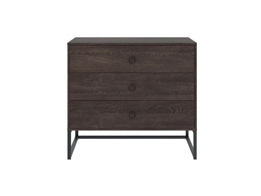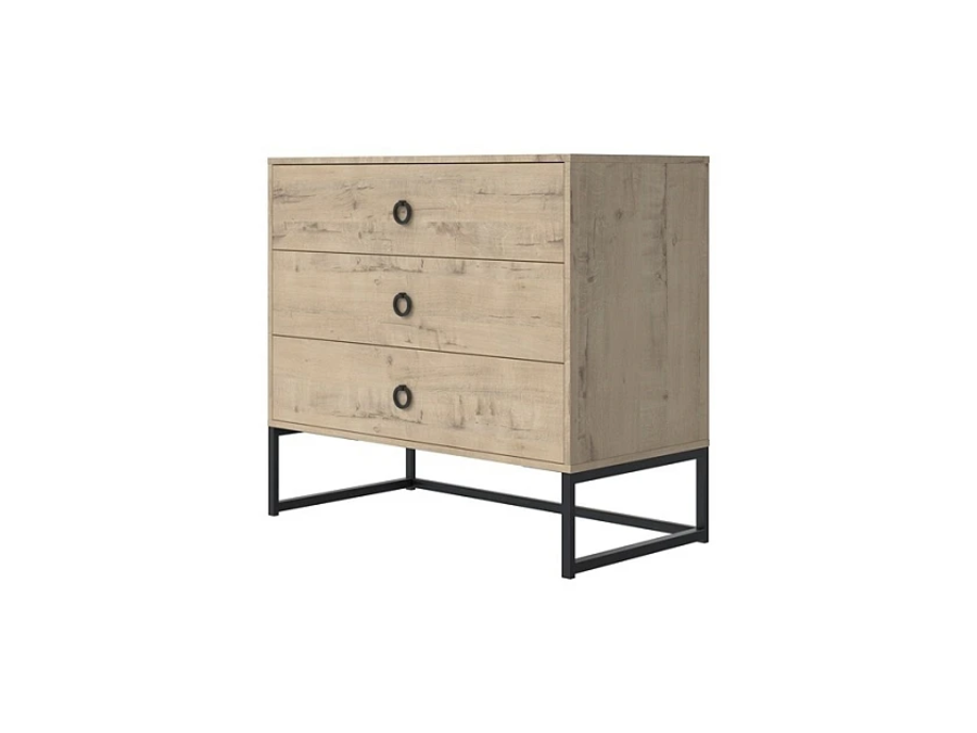 Frame - комод для тех, кто любит современный интерьер без лишних украшений. Контраст древесных фактур ЛДСП и чёрных металлических опор создаёт характерный лофт-образ, который одинаково уместен в городской квартире, на даче и в загородном доме. Три ящика с доводчиками - и никаких хлопков при закрытии.