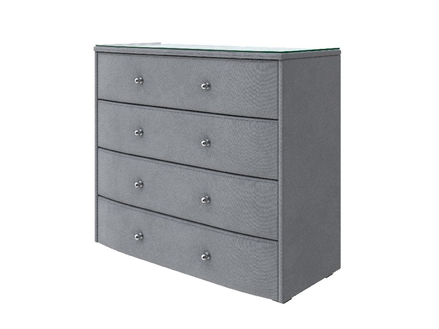 Фасады ящиков и корпус комода обиты мебельной тканью различных типов и расцветок.