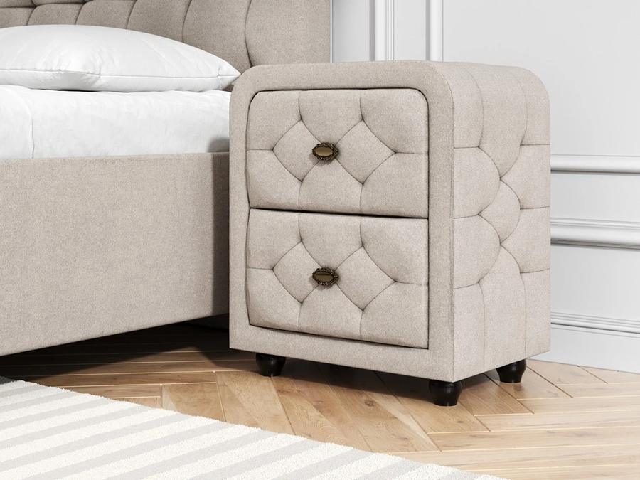 Каркас тумбы выполне из ДСП. В качестве обивочного материала используется экокожа класса "Люкс" или мебельная ткань на выбор.